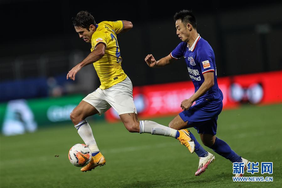 9月21日,江苏苏宁易购队球员埃德尔(左)在比赛中带球突破。 当日,在2020赛季中国足球协会超级联赛第一阶段(大连赛区)第12轮比赛中,江苏苏宁易购队以0比0战平上海绿地申花队。 新华社记者潘昱龙摄