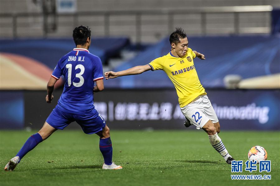 9月21日,江苏苏宁易购队球员吴曦(右)在比赛中传球。 当日,在2020赛季中国足球协会超级联赛第一阶段(大连赛区)第12轮比赛中,江苏苏宁易购队以0比0战平上海绿地申花队。 新华社记者潘昱龙摄