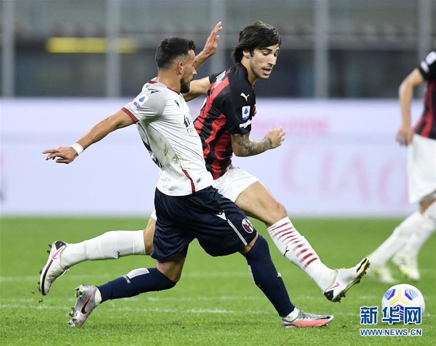 9月21日,AC米兰队球员托纳利(右)在比赛中和博洛尼亚队球员桑索内拼抢。 当日,在2020-2021赛季意大利足球甲级联赛首轮比赛中,AC米兰队主场以2比0战胜博洛尼亚队。 新华社发(阿尔贝托·林格利亚摄)