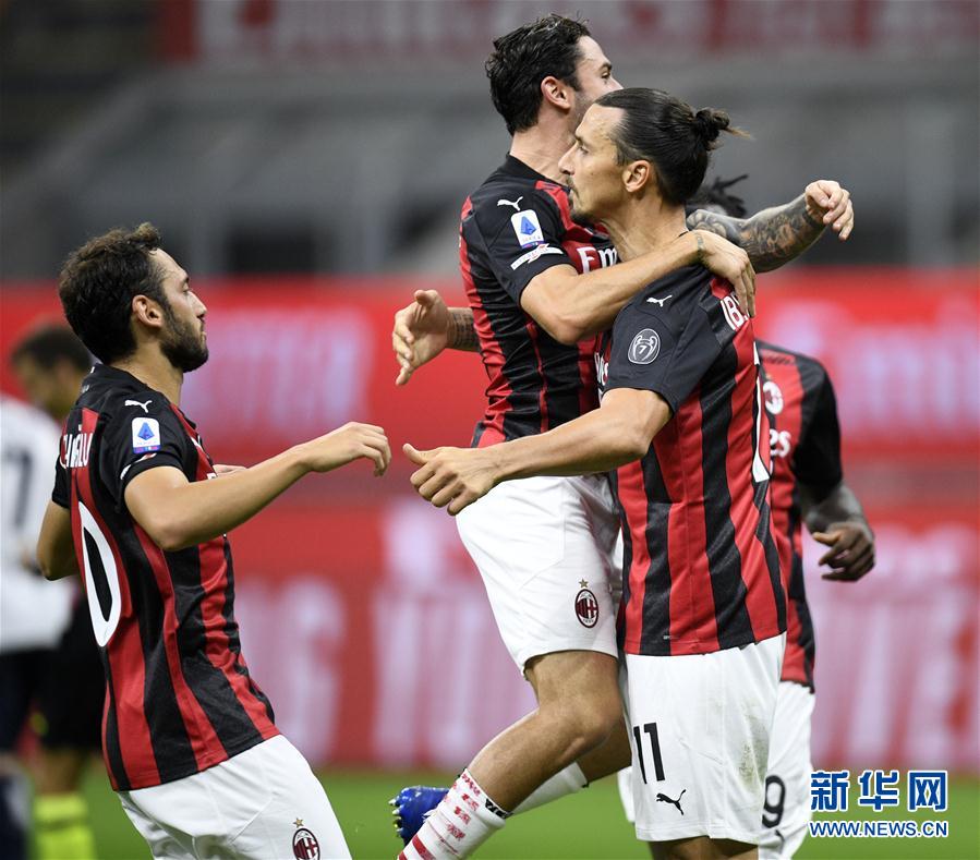 9月21日,AC米兰队球员伊布拉希莫维奇(右)在进球后和队友庆祝。 当日,在2020-2021赛季意大利足球甲级联赛首轮比赛中,AC米兰队主场以2比0战胜博洛尼亚队。 新华社发(阿尔贝托·林格利亚摄)