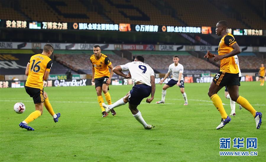 9月21日,曼彻斯特城队球员热苏斯(中)射门得分。 当日,在2020-2021赛季英格兰足球超级联赛第二轮比赛中,曼彻斯特城队客场以3比1战胜狼队。 新华社/路透