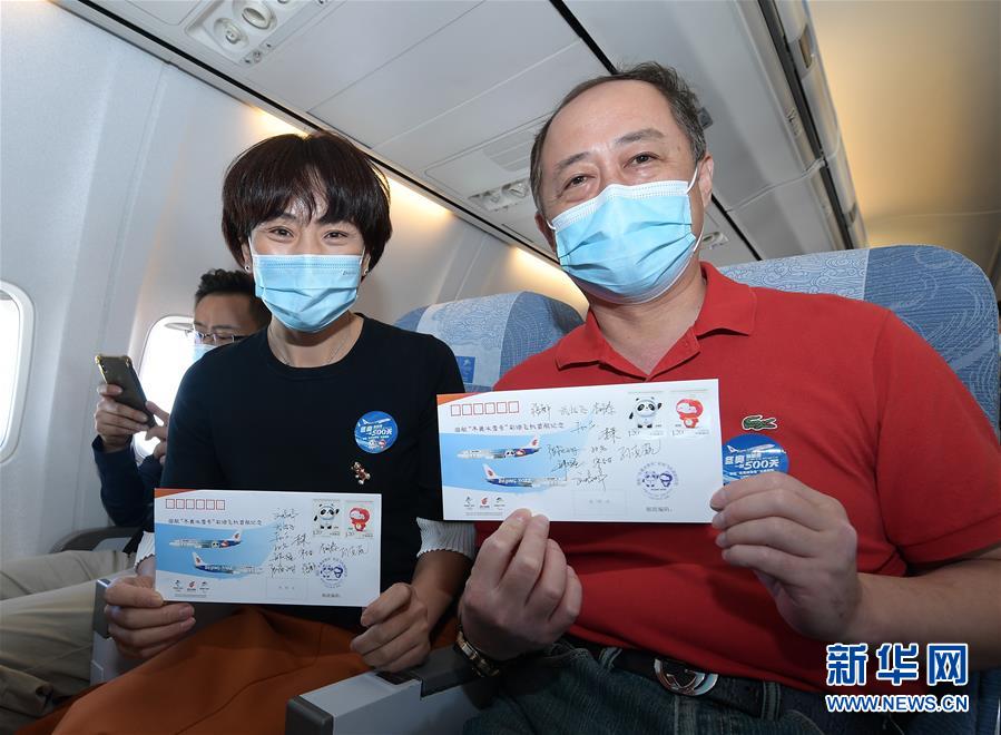 9月22日,两位北京援鄂医疗队代表在飞行途中获赠国航“冬奥冰雪号”飞机全体机组成员签名的冬奥彩绘飞机纪念封。 当日,中国国际航空公司“冬奥冰雪号”飞机首次飞抵武汉。10余位曾参加援鄂抗疫的北京医疗队医护工作者代表受邀搭乘“冬奥冰雪号”,并在飞行途中参加纪念活动。 新华社记者 李贺 摄