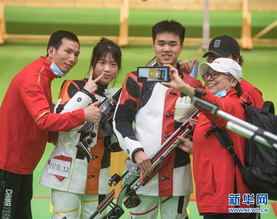 9月22日,余浩楠(左三)/杨倩(左二)在赛后与教练员合影。 当日,在湖北宜昌进行的2020年全国射击冠军赛(步枪项目)10米气步枪混合团体决赛中,国家集训队选手余浩楠/杨倩战胜队友徐红/惠子程,获得冠军。 新华社记者肖艺九摄