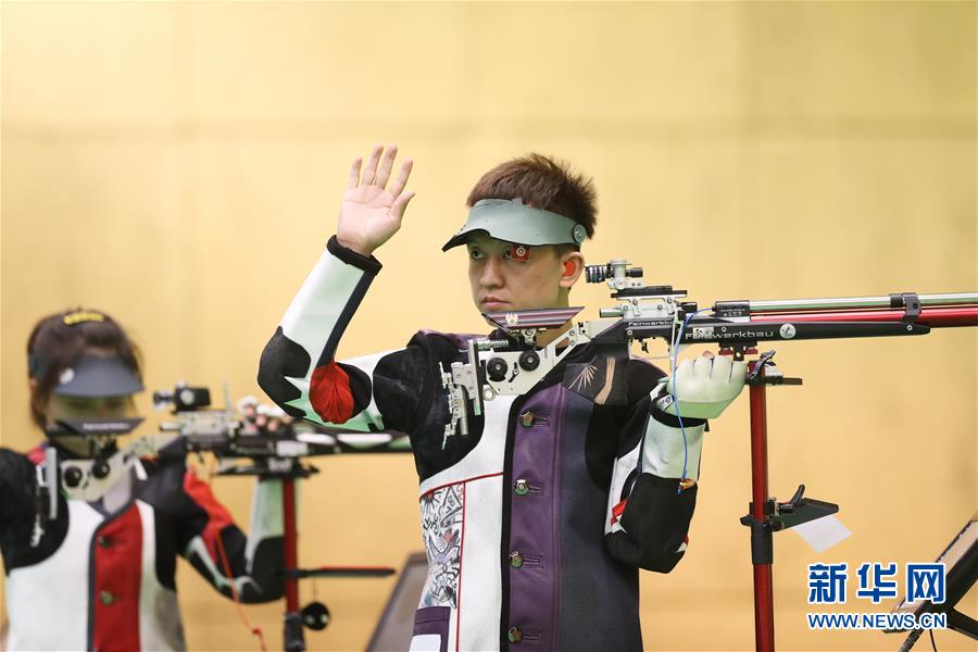 9月22日,惠子程(右)在赛前向观众致意。 当日,在湖北宜昌进行的2020年全国射击冠军赛(步枪项目)10米气步枪混合团体决赛中,国家集训队选手徐红/惠子程以11比17不敌队友余浩楠/杨倩,获得亚军。 新华社记者丁汀摄