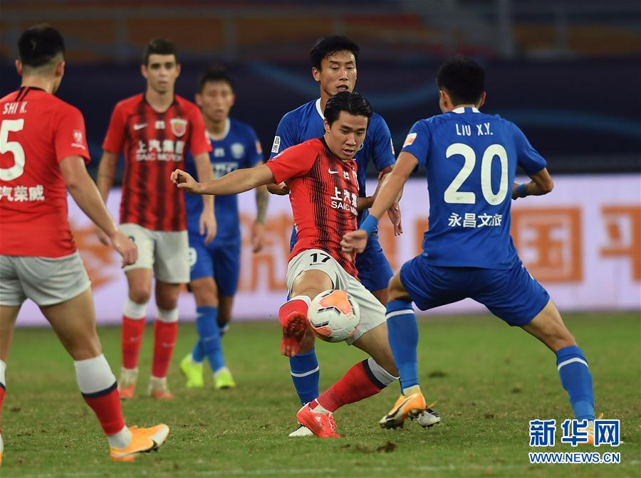 9月22日,上海上港队球员陈彬彬(右二)在比赛中拼抢。 当日,在2020赛季中国足球协会超级联赛第一阶段(苏州赛区)第12轮比赛中,上海上港队以1比0战胜石家庄永昌队。 新华社记者 季春鹏 摄