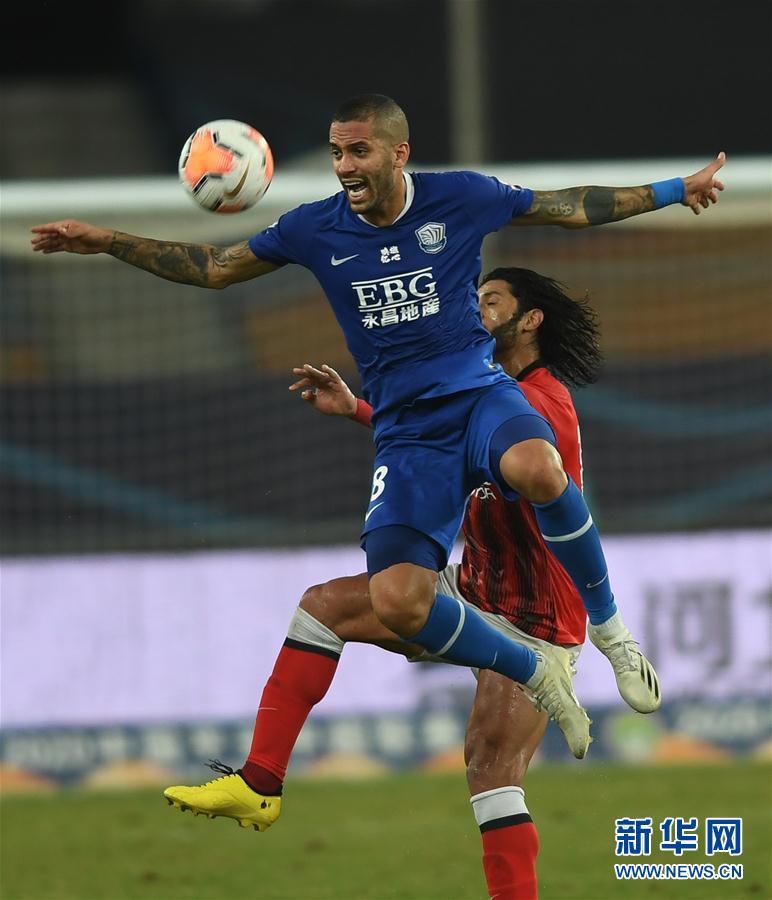 9月22日,石家庄永昌队球员罗穆洛(前)与上海上港队球员胡尔克拼抢。 当日,在2020赛季中国足球协会超级联赛第一阶段(苏州赛区)第12轮比赛中,上海上港队以1比0战胜石家庄永昌队。 新华社记者 季春鹏 摄