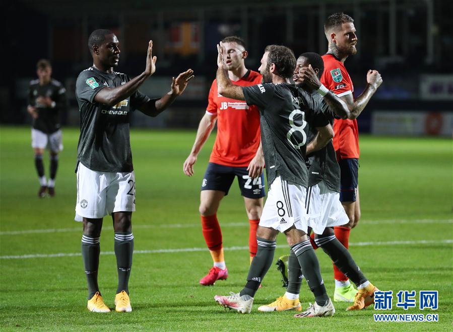 9月22日,曼联队球员马塔(右三)在打入点球后和队友庆祝。 当日,在2020-2021赛季英格兰足球联赛杯第三轮比赛中,曼彻斯特联队客场以3比0战胜卢顿队,晋级下一轮。 新华社/路透