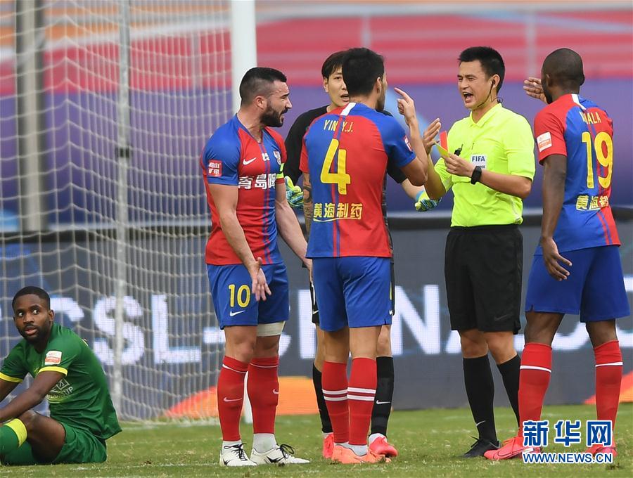 2020赛季中超联赛第一阶段第12轮全部八场比赛于9月21日、22日两天结束争夺。21日,在大连赛区的四场比赛中,排名该赛区榜首的广州恒大凭借艾克森和保利尼奥的进球2:1战胜排名垫底的河南建业。上海申花与江苏苏宁的“长三角德比”则以互交白卷告终。山东鲁能2:1力克深圳佳兆业,广州富力队则在伤停补时阶段1:0绝杀大连人队。22日,在苏州赛区进行的四场比赛中,上海上港队和北京国安队双双获胜后已经稳居赛区前两名,河北华夏幸福队绝杀天津泰达队升至第三,武汉卓尔队0:1输给重庆当代队后,已跌至第六位。 北京中赫国安 5-1 青岛黄海青港 9月22日下午,北京国安队在中超联赛第一阶段苏州赛区第12轮的比赛中5:1大胜青岛黄海队,提前两轮锁定赛区前四,国安外援巴坎布本场比赛打入个人第十球,暂时登上射手榜首。 上轮联赛国安3:3战平河北华夏幸福队,错过了提前锁定前四的机会。本场比赛他们完全掌控了场上局面,于洋在第13分钟就为国安打破僵局,阿兰前17分钟两次打中立柱。比埃拉和替补登场的费尔南多分别建功,国安上半场就3:0领先。不过大比分领先的国安遭到重大打击,奥古斯托仅打了28分钟就在无对抗的情况下伤退,让这场胜利蒙上一层阴影。 下半场开始不久,青岛后卫殷亚吉吃到第二张黄牌被罚下,少一人让比赛变得更是毫无悬念。比埃拉任意球得手,巴坎布补射破门,国安5:0领先。补时阶段,青岛凭借一粒点球挽回一点颜面,最终比分定格为5:1。 图为9月22日,青岛黄海青港队殷亚吉(右三)因放倒北京中赫国安队球员巴坎布(左一)犯规吃到本场比赛第二张黄牌,被主裁判李海新(右二)出示红牌罚下。 新华社记者季春鹏摄
