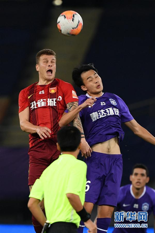 9月22日,河北华夏幸福队球员梅米舍维奇(上左)与天津泰达队球员刘若钒争顶头球。 当日,在2020赛季中国足球协会超级联赛第一阶段(苏州赛区)第12轮比赛中,河北华夏幸福队以1比0战胜天津泰达队。 新华社记者 韩瑜庆 摄
