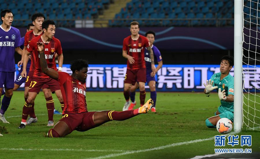 9月22日,河北华夏幸福队球员马尔考(前左)在比赛中倒地射门。 当日,在2020赛季中国足球协会超级联赛第一阶段(苏州赛区)第12轮比赛中,河北华夏幸福队以1比0战胜天津泰达队。 新华社记者 韩瑜庆 摄