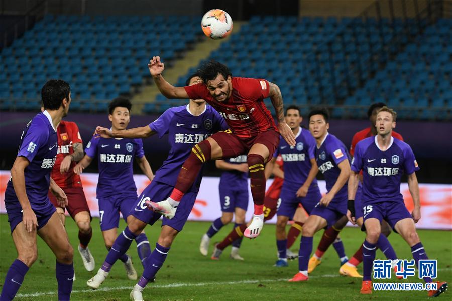 9月22日,河北华夏幸福队球员高拉特(右四)在比赛中争顶头球。 当日,在2020赛季中国足球协会超级联赛第一阶段(苏州赛区)第12轮比赛中,河北华夏幸福队以1比0战胜天津泰达队。 新华社记者 韩瑜庆 摄