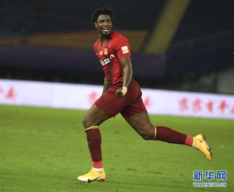 9月22日,河北华夏幸福队球员马尔考庆祝进球。 当日,在2020赛季中国足球协会超级联赛第一阶段(苏州赛区)第12轮比赛中,河北华夏幸福队以1比0战胜天津泰达队。 新华社记者 韩瑜庆 摄