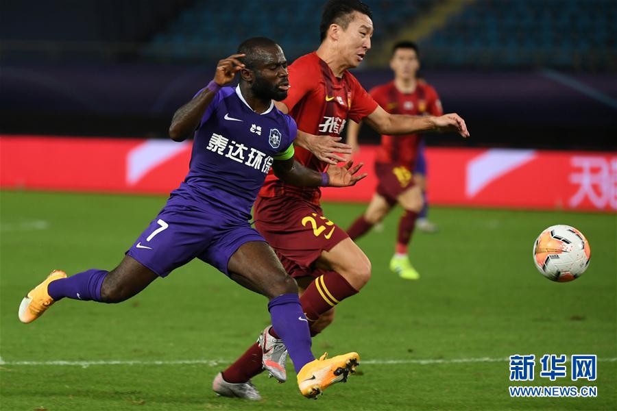 9月22日,天津泰达队球员阿奇姆彭(左)与河北华夏幸福队球员任航在比赛中拼抢。 当日,在2020赛季中国足球协会超级联赛第一阶段(苏州赛区)第12轮比赛中,河北华夏幸福队以1比0战胜天津泰达队。 新华社记者 韩瑜庆 摄
