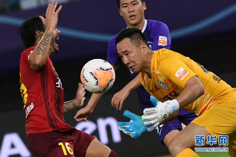 9月22日,天津泰达队球员守门员滕尚坤(右)在比赛中防守河北华夏幸福队球员高拉特的进攻。 当日,在2020赛季中国足球协会超级联赛第一阶段(苏州赛区)第12轮比赛中,河北华夏幸福队以1比0战胜天津泰达队。 新华社记者 韩瑜庆 摄
