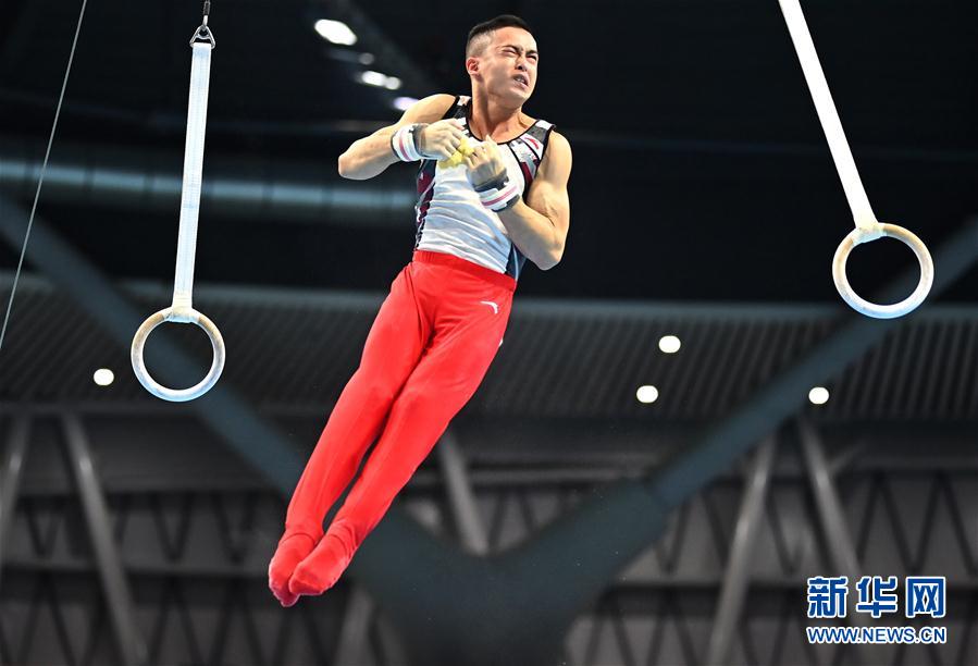 9月23日,江苏队选手杨焱智在吊环比赛中。 当日,2020年全国体操锦标赛在广东肇庆新区体育中心体育馆开赛,比赛第一天进行男子资格赛曁团体决赛。 新华社记者 程敏 摄