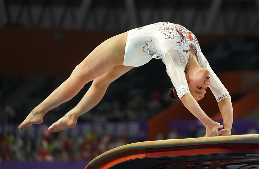 9月24日,广东队选手刘景行在跳马比赛中。 当日,在广东肇庆举行的2020年全国体操锦标赛女子团体决赛中,广东队以214.800分的总成绩获得冠军。 新华社记者程敏摄