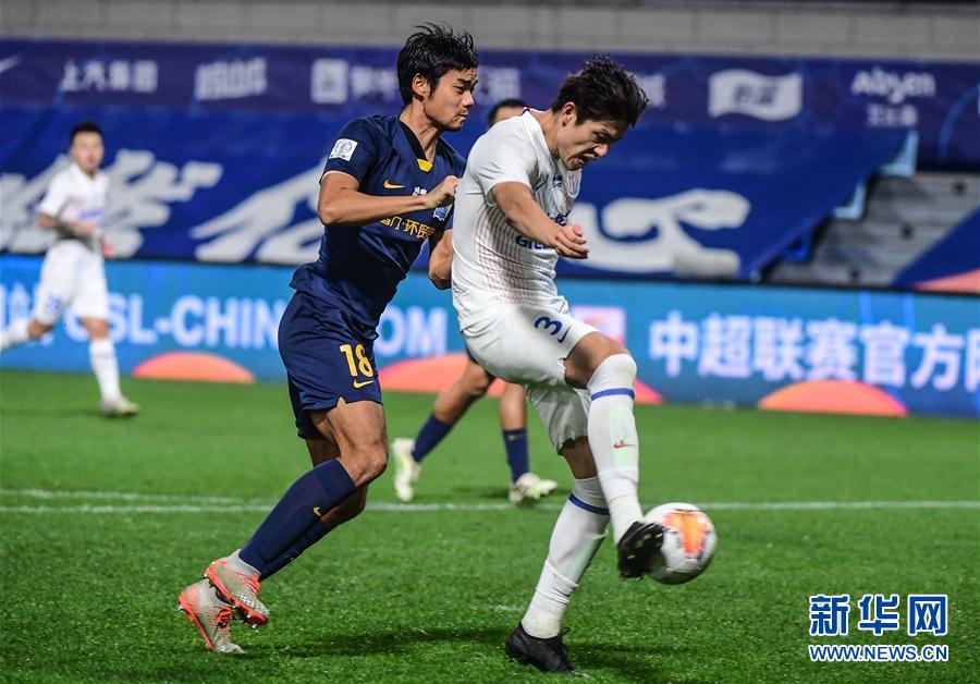 9月24日,上海绿地申花队球员毕津浩(右)在比赛中射门。 当日,在2020赛季中国足球协会超级联赛第一阶段(大连赛区)第13轮比赛中,上海绿地申花队以2比0战胜广州富力队。 新华社发(谢永亮摄)