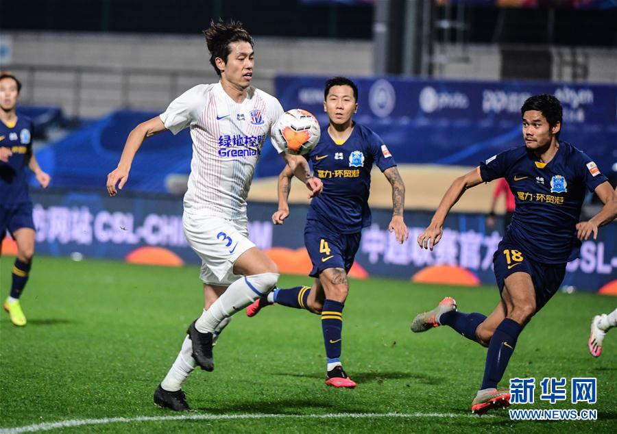 9月24日,上海绿地申花队球员毕津浩(左)在比赛中带球突破。 当日,在2020赛季中国足球协会超级联赛第一阶段(大连赛区)第13轮比赛中,上海绿地申花队以2比0战胜广州富力队。 新华社发(谢永亮摄)