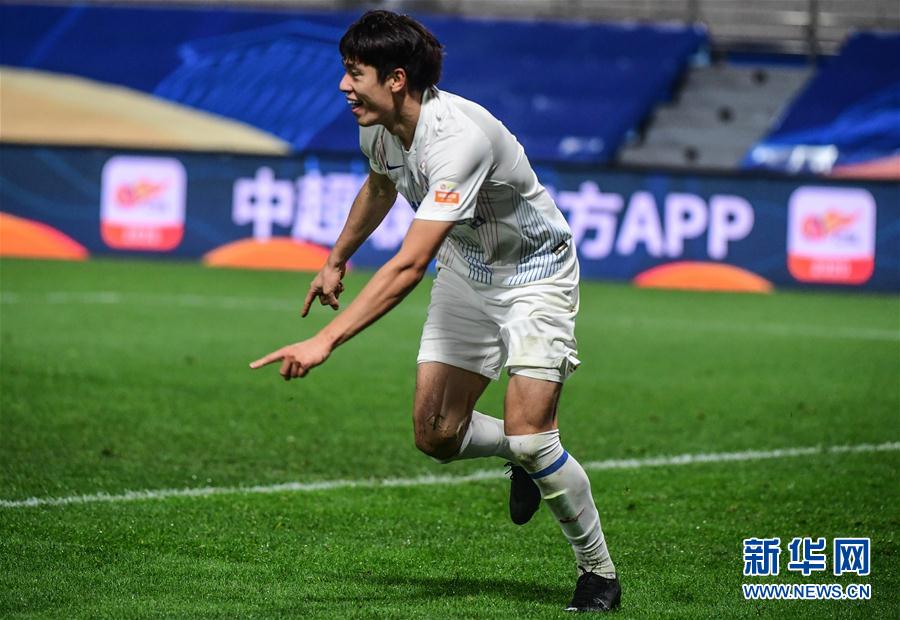 9月24日,上海绿地申花队球员毕津浩在比赛中庆祝进球。 当日,在2020赛季中国足球协会超级联赛第一阶段(大连赛区)第13轮比赛中,上海绿地申花队以2比0战胜广州富力队。 新华社发(谢永亮摄)