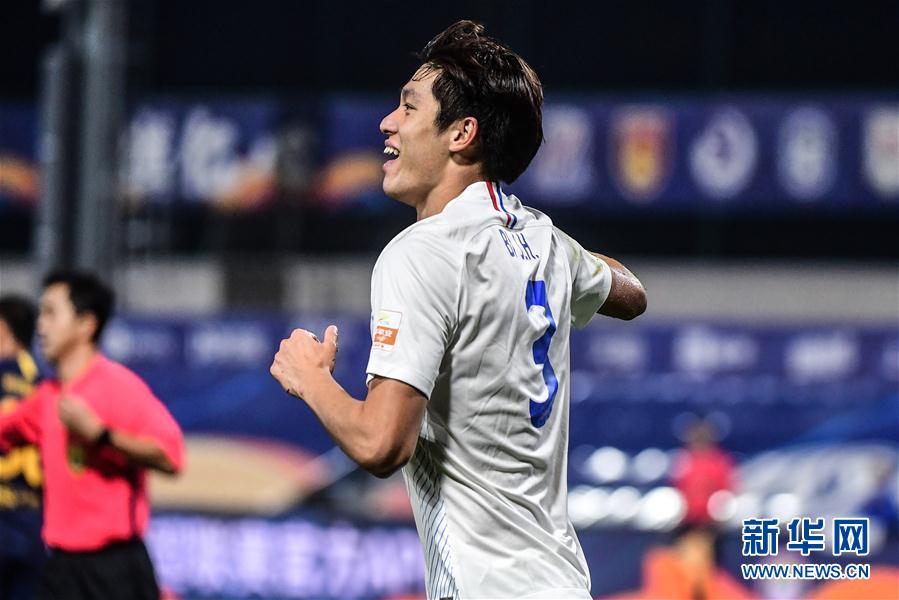 9月24日,上海绿地申花队球员毕津浩在比赛中庆祝进球。 当日,在2020赛季中国足球协会超级联赛第一阶段(大连赛区)第13轮比赛中,上海绿地申花队以2比0战胜广州富力队。 新华社发(谢永亮摄)