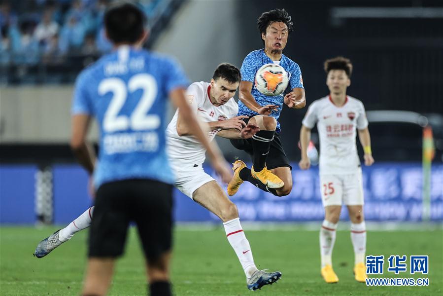 9月24日,大连人队球员郑龙(右二)与深圳佳兆业队球员塞尔纳斯(左二)在比赛中拼抢。 当日,在2020赛季中国足球协会超级联赛第一阶段(大连赛区)第13轮比赛中,深圳佳兆业队以3比1战胜大连人队。 新华社记者潘昱龙摄