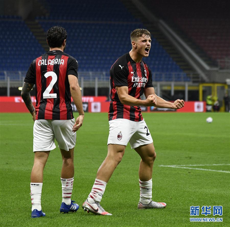 9月24日,AC米兰队球员科隆博(右)在比赛中庆祝进球。 当日,在2020-2021年欧罗巴联赛第三轮资格赛中,意甲AC米兰队主场以3比2战胜挪威博多格林特队。 新华社发(阿尔贝托·林格利亚 摄)