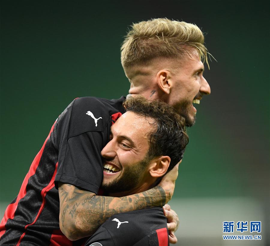 9月24日,AC米兰队球员恰尔汗奥卢(下)与队友卡斯蒂列霍斯庆祝进球。 当日,在2020-2021年欧罗巴联赛第三轮资格赛中,意甲AC米兰队主场以3比2战胜挪威博多格林特队。 新华社发(阿尔贝托·林格利亚 摄)