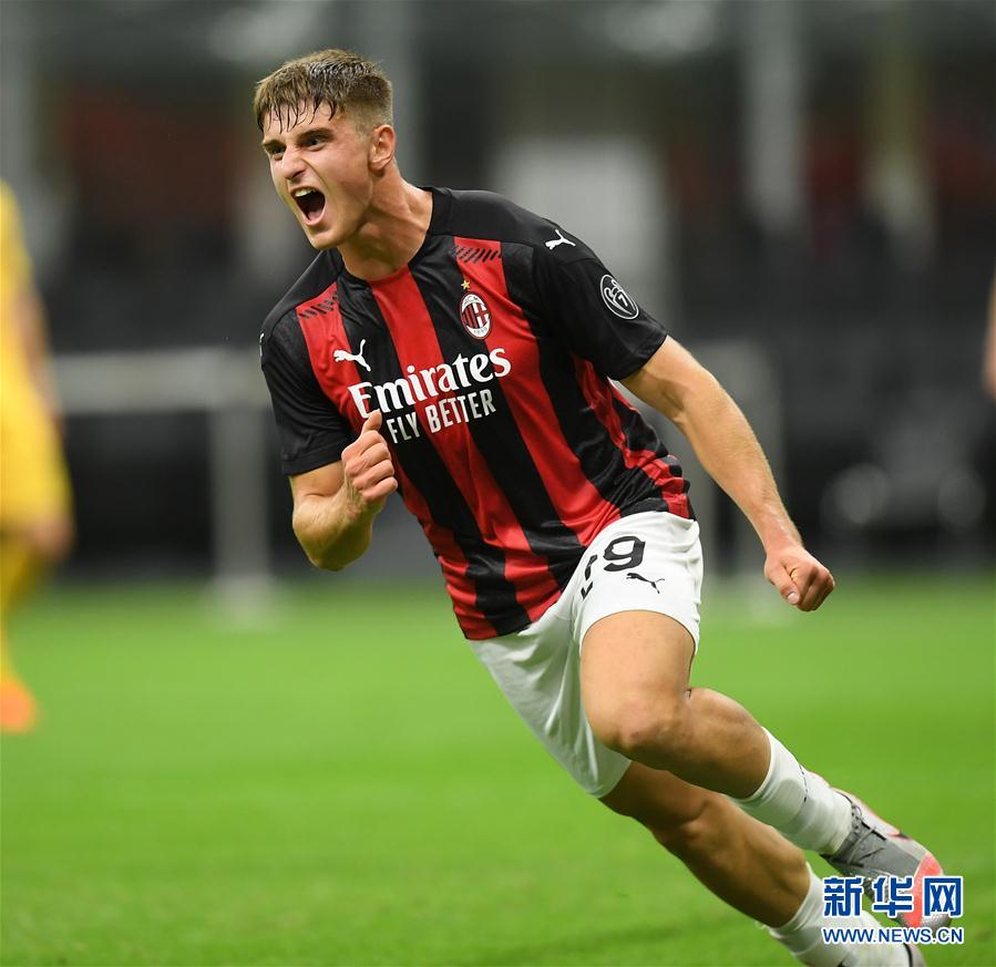 9月24日,AC米兰队球员科隆博在比赛中庆祝进球。 当日,在2020-2021年欧罗巴联赛第三轮资格赛中,意甲AC米兰队主场以3比2战胜挪威博多格林特队。 新华社发(阿尔贝托·林格利亚 摄)