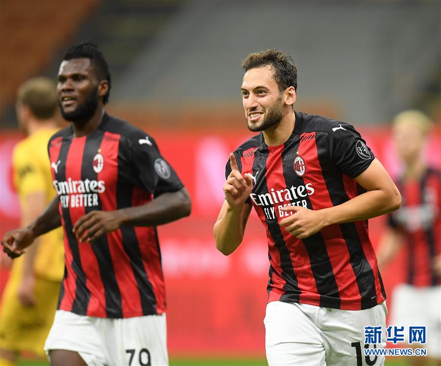 9月24日,AC米兰队球员恰尔汗奥卢(右)在比赛中庆祝进球。 当日,在2020-2021年欧罗巴联赛第三轮资格赛中,意甲AC米兰队主场以3比2战胜挪威博多格林特队。 新华社发(阿尔贝托·林格利亚 摄)