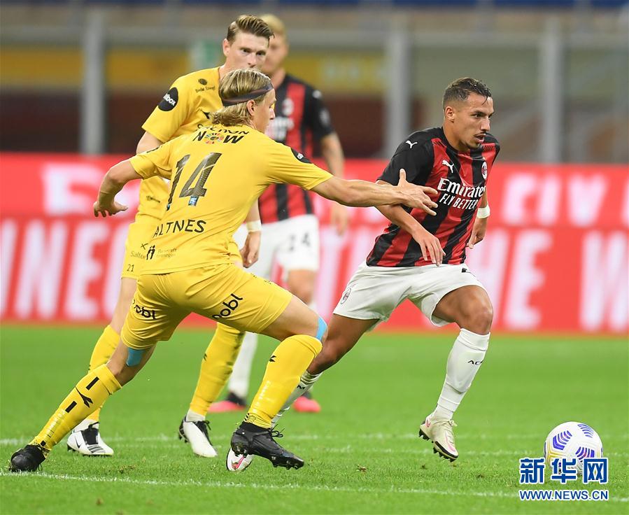 9月24日,AC米兰队球员贝纳塞(右)在比赛中带球突破。 当日,在2020-2021年欧罗巴联赛第三轮资格赛中,意甲AC米兰队主场以3比2战胜挪威博多格林特队。 新华社发(阿尔贝托·林格利亚 摄)