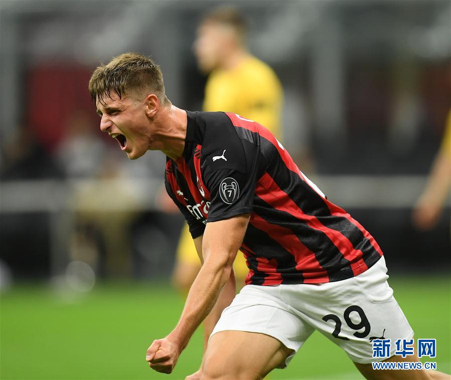 9月24日,AC米兰队球员科隆博在比赛中庆祝进球。 当日,在2020-2021年欧罗巴联赛第三轮资格赛中,意甲AC米兰队主场以3比2战胜挪威博多格林特队。 新华社发(阿尔贝托·林格利亚 摄)