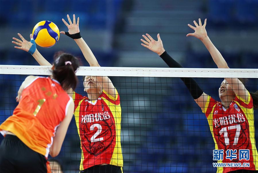 9月24日,上海光明优倍队球员张钰倩(中)与仲慧(右)在比赛中拦网。 当日,在广东江门举行的2020年全国女排锦标赛第一阶段A组第二轮比赛中,上海光明优倍队以3比0战胜天津渤海银行队。 新华社记者秦朗摄