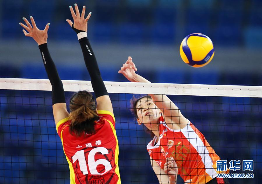 9月24日,天津渤海银行队球员李盈莹(右)在比赛中扣球。 当日,在广东江门举行的2020年全国女排锦标赛第一阶段A组第二轮比赛中,天津渤海银行队以0比3不敌上海光明优倍队。 新华社记者秦朗摄