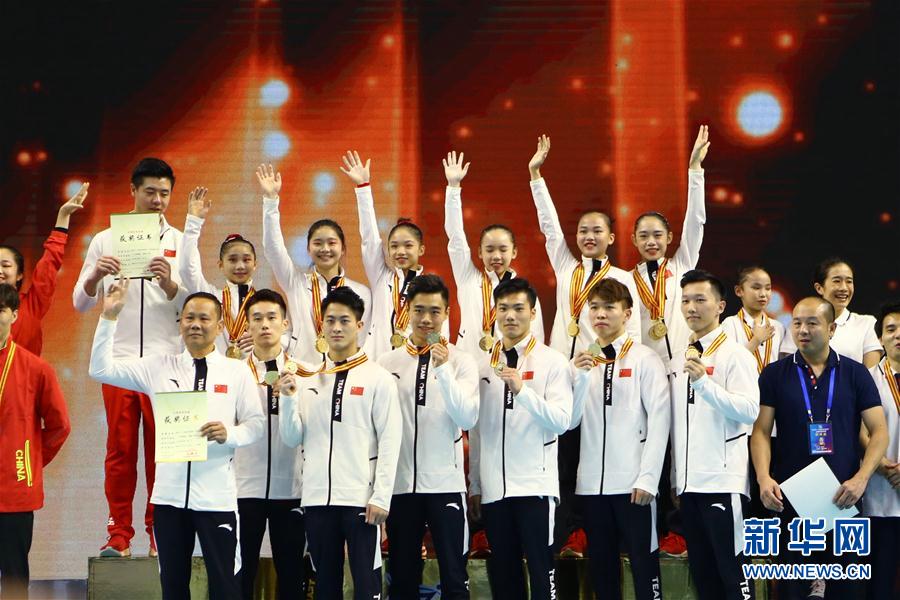 9月24日,冠军广东队在颁奖仪式上合影。 当日,在广东肇庆举行的2020年全国体操锦标赛中,广东队以542.550分的成绩获得男女混合团体冠军。 新华社记者许雅楠摄