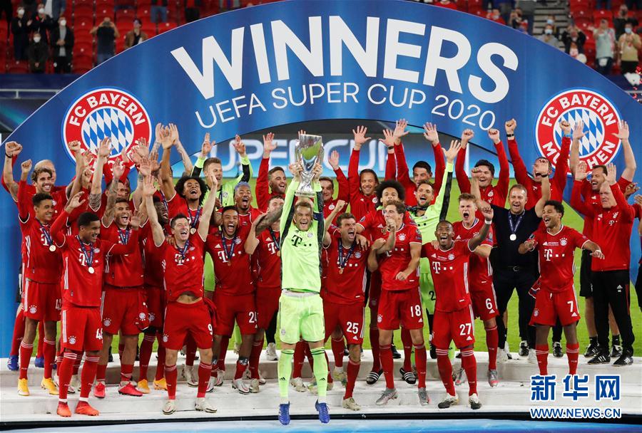 9月24日,拜仁慕尼黑队队长诺伊尔(前中)在颁奖仪式上高举奖杯。 当日,在匈牙利布达佩斯举行的2020年欧洲超级杯足球赛中,德甲拜仁慕尼黑队经过加时赛以2比1战胜西甲塞维利亚队,夺得欧洲超级杯。 新华社/路透