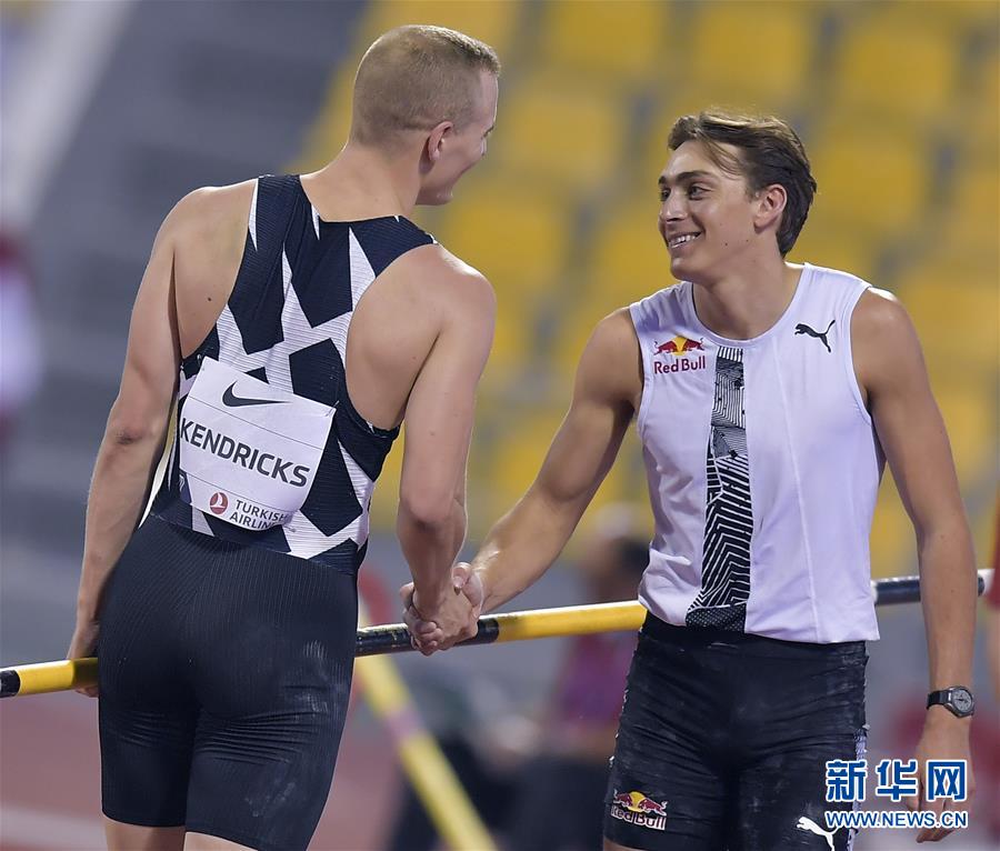 9月25日,冠军瑞典选手杜普兰蒂斯(右)在比赛中和亚军美国选手肯德里克斯致意。 当日,在2020世界田联钻石联赛多哈站男子撑杆跳高比赛中,瑞典选手杜普兰蒂斯以5米82的成绩夺冠。 新华社发(尼库摄)