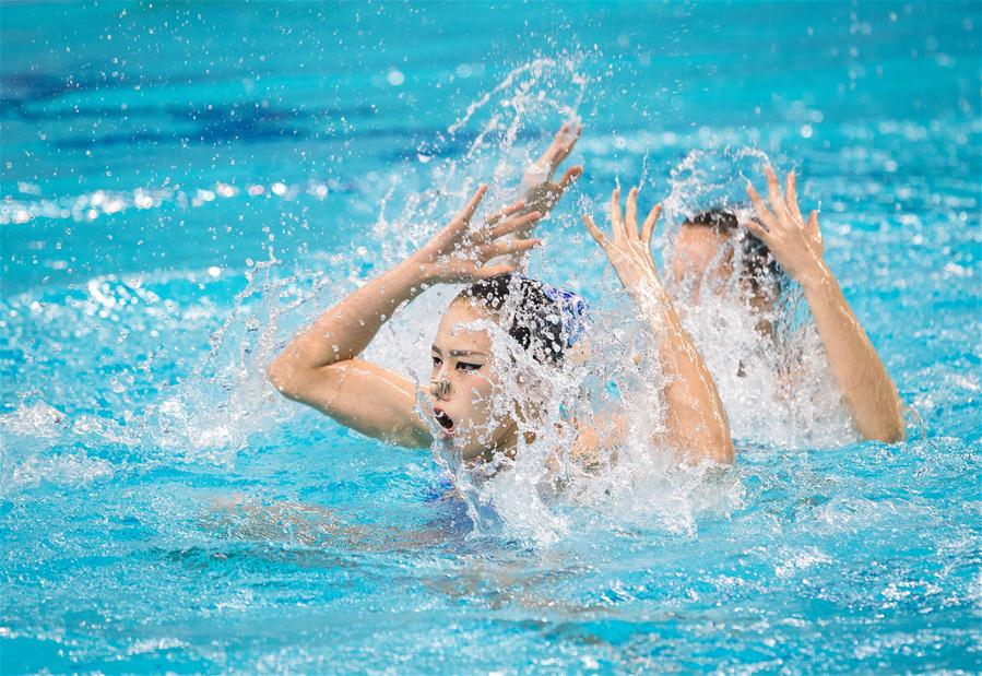 9月27日,四川洲克队选手戴诗意/向玢璇在双人自由自选决赛中。最终,她们以175.6395分的总成绩获得双人亚军。 当日,2020年全国花样游泳锦标赛双人自由自选决赛在湖北武汉举行。 新华社记者 肖艺九 摄
