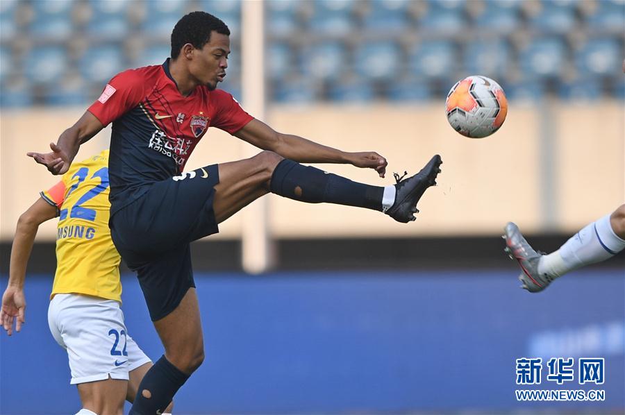 9月27日,深圳佳兆业队球员普雷西亚多在比赛中停球。 当日,在2020赛季中国足球协会超级联赛第一阶段(大连赛区)第14轮比赛中,江苏苏宁易购队以1比0战胜深圳佳兆业队。 新华社记者 龙雷 摄
