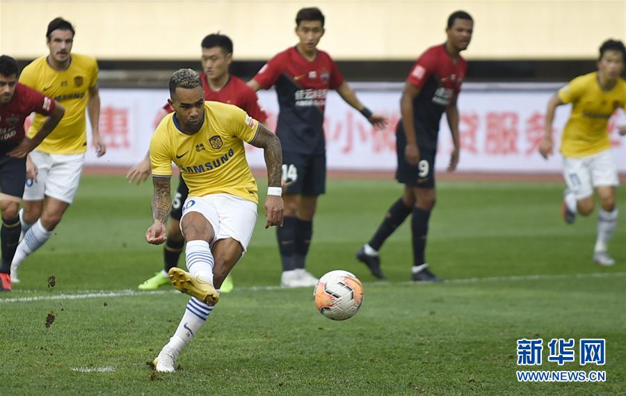 9月27日,江苏苏宁易购队球员特谢拉(前)在比赛中主罚点球命中。 当日,在2020赛季中国足球协会超级联赛第一阶段(大连赛区)第14轮比赛中,江苏苏宁易购队以1比0战胜深圳佳兆业队。 新华社记者 龙雷 摄