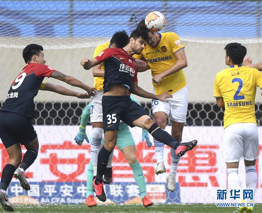9月27日,深圳佳兆业队球员波拉里干吉(左三)在比赛中与江苏苏宁易购队球员桑蒂尼(右二)、杨博宇(左二)挣顶。 当日,在2020赛季中国足球协会超级联赛第一阶段(大连赛区)第14轮比赛中,江苏苏宁易购队以1比0战胜深圳佳兆业队。 新华社记者 龙雷 摄
