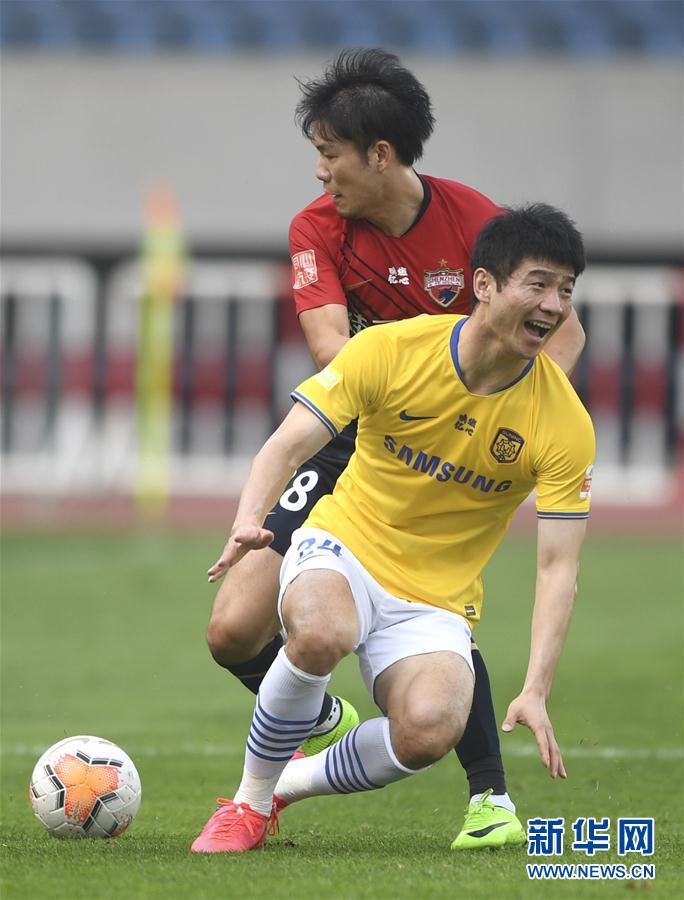 9月27日,江苏苏宁易购队球员吉翔(前)与深圳佳兆业队球员李源一在比赛中拼抢。 当日,在2020赛季中国足球协会超级联赛第一阶段(大连赛区)第14轮比赛中,江苏苏宁易购队以1比0战胜深圳佳兆业队。 新华社记者 龙雷 摄