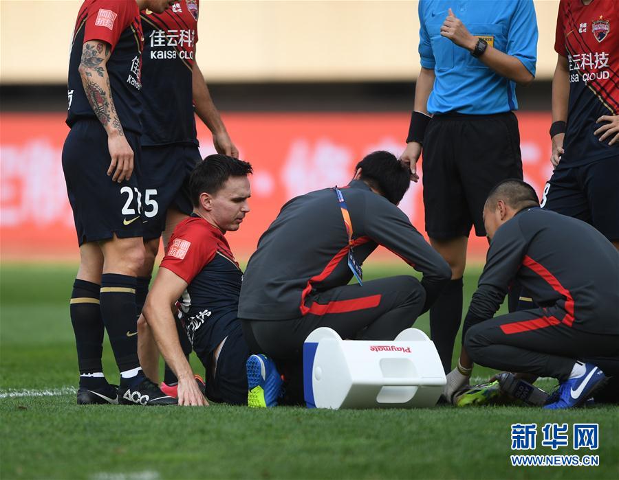 9月27日,深圳佳兆业队球员塞尔纳斯(下左)在比赛中治疗。 当日,在2020赛季中国足球协会超级联赛第一阶段(大连赛区)第14轮比赛中,江苏苏宁易购队以1比0战胜深圳佳兆业队。 新华社记者 龙雷 摄
