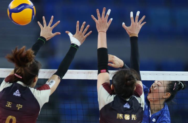 9月27日,福建安溪铁观音队球员郑益昕(中)在比赛中。 当日,在广东江门举行的2020年全国女排锦标赛第一阶段A组第五轮比赛中,上海光明优倍队以3比0战胜福建安溪铁观音队。 新华社记者秦朗摄
