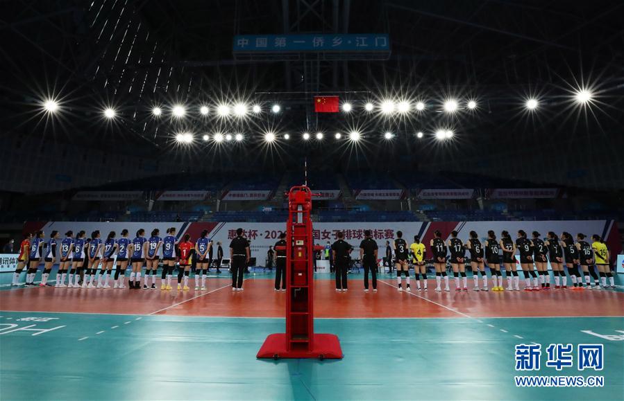 9月27日,上海光明优倍队球员(左)与福建安溪铁观音队球员在赛前唱国歌仪式上。 当日,在广东江门举行的2020年全国女排锦标赛第一阶段A组第五轮比赛中,上海光明优倍队以3比0战胜福建安溪铁观音队。 新华社记者秦朗摄