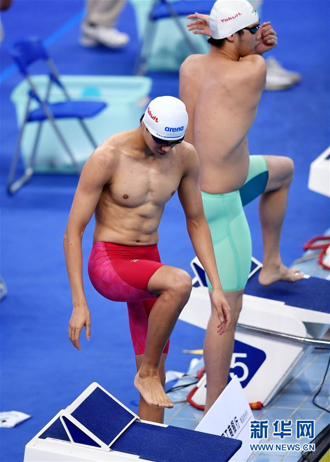 9月28日,季新杰(左)在比赛前。 当日,在青岛举行的2020全国游泳冠军赛暨东京奥运会达标赛男子200米自由泳决赛中,山东浩沙队选手季新杰以1分47秒42的成绩获得冠军。 新华社记者 李紫恒 摄