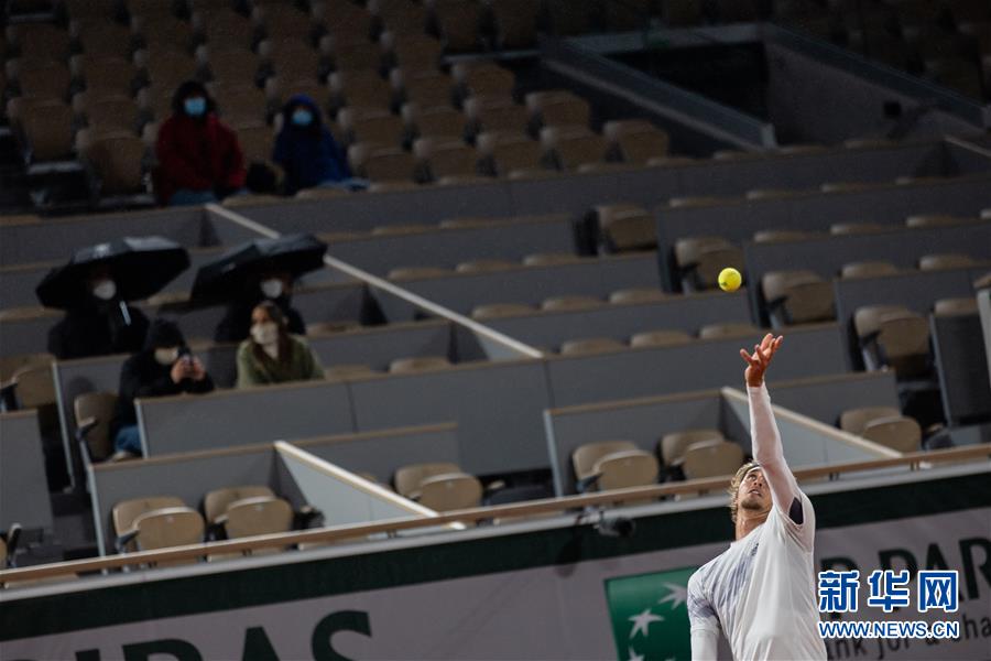 9月27日,兹维列夫在比赛中发球。 当日,在法国巴黎进行的2020年法国网球公开赛男单首轮比赛中,德国选手兹维列夫以3比0战胜奥地利选手诺瓦克,晋级下一轮。 新华社发(奥雷利安·莫里萨尔摄)