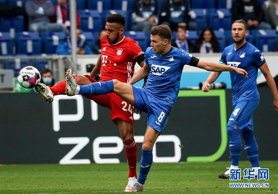 9月27日,拜仁慕尼黑队球员托利索(左)在比赛中与霍芬海姆队球员盖格尔拼抢。 当日,在2020-2021赛季德国足球甲级联赛第二轮比赛中,拜仁慕尼黑队客场以1比4不敌霍芬海姆队。 新华社发