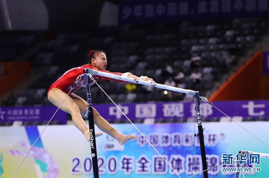 9月27日,福建队选手程诗怡在高低杠决赛中。最终,她以14.866分的成绩获得亚军。 当日,2020年全国体操锦标赛高低杠决赛在广东肇庆举行。 新华社记者 许雅楠 摄