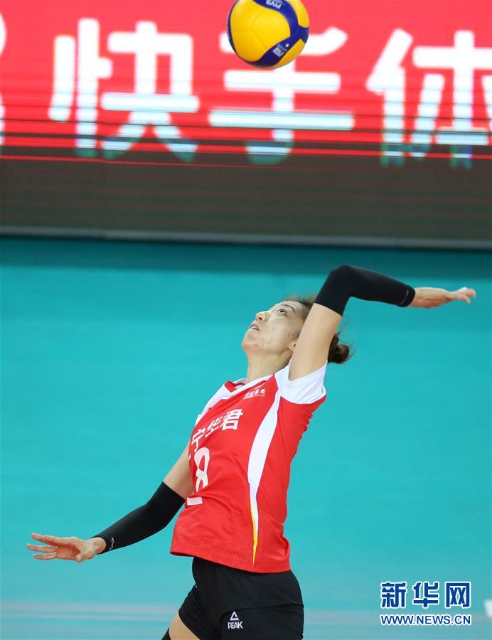 9月28日,辽宁华君队球员丁霞在比赛中发球。 当日,在广东江门举行的2020年全国女排锦标赛第一阶段B组第四轮比赛中,辽宁华君队以1比3不敌浙江嘉善西塘古镇队。 新华社记者秦朗摄