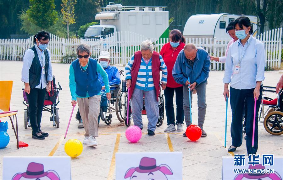 9月28日,参加“赶猪”比赛的选手在比赛中。 国庆、中秋佳节前夕,北京太阳城老年公寓举办了一场趣味运动会,颠球跑、轮椅竞技、投篮球、趣味保龄球和太极剑等项目吸引了众多在住老年人参加。 新华社发(陈晓伟摄)